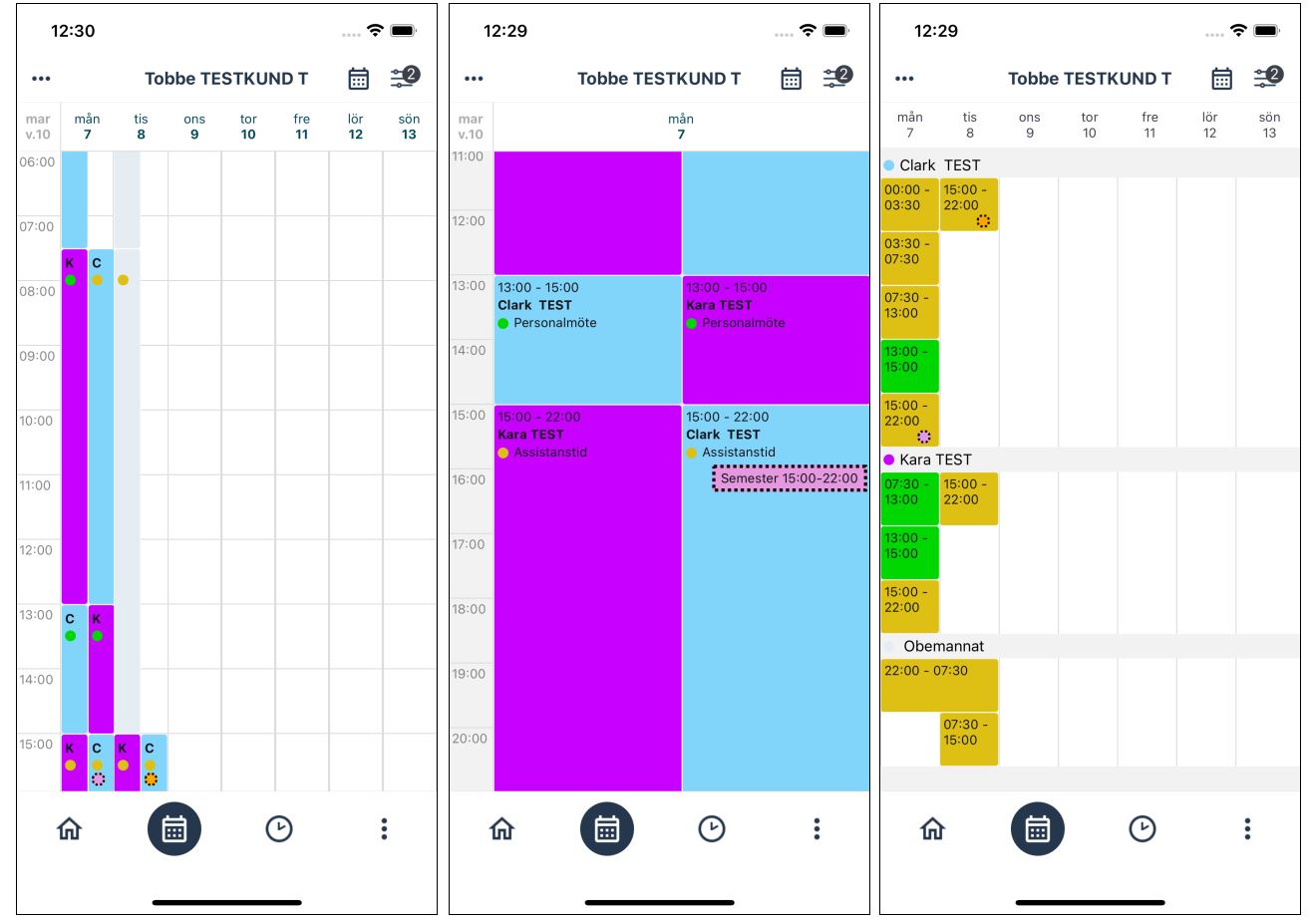 Du kan se din arbetsgrupps schema, veckovy, dagsvy och resursvy.
