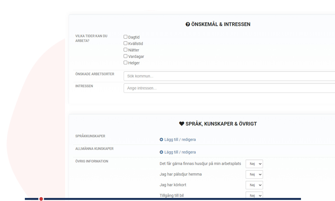 Du som är arbetssökande eller redan anställd kan själv skapa en rekryteringsprofil om du vill arbeta mer. Där får du fylla i alla uppgifter som krävs för att söka en tjänst. Du får svara på frågor, skriva ett personligt brev, fylla i tidigare anställningar samt referenser. Är du inte intresserad av en specifik tjänst men ändå vill göra dig tillgänglig för framtida arbete går det självklart att bara skapa en profil och fylla i ditt CV. Så länge du finns bland de sökande finns chansen att du blir tillfrågad om arbete.